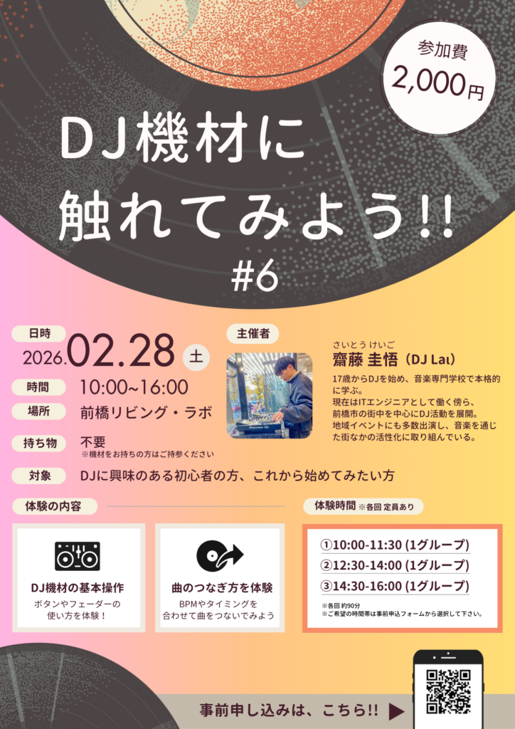 DJに興味のある初心者の方、これから始めてみたい方を対象にしたイベント「DJ機材に触れてみよう!! #6」 が、2月28日(土)に前橋リビング・ラボで開催されます!