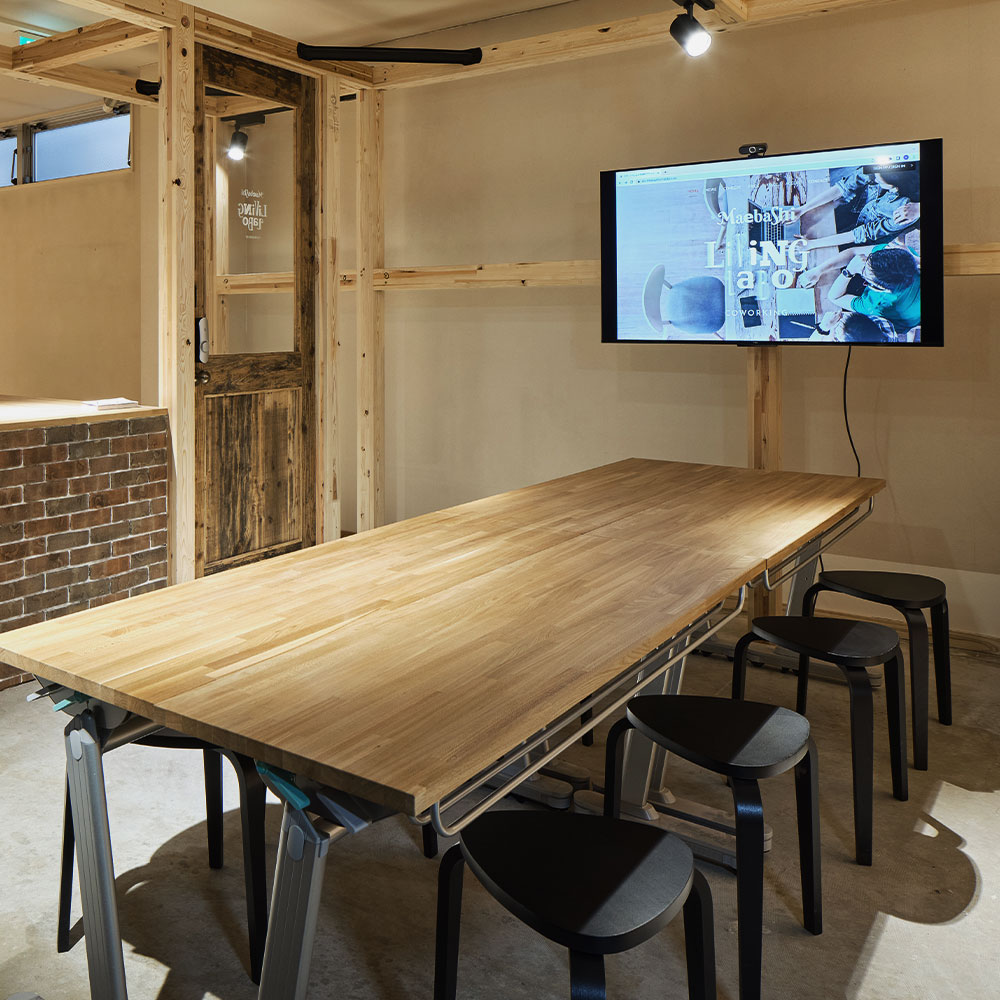 メンバー集まってのミーティングやワークショップにも利用できるオープンテーブル。
